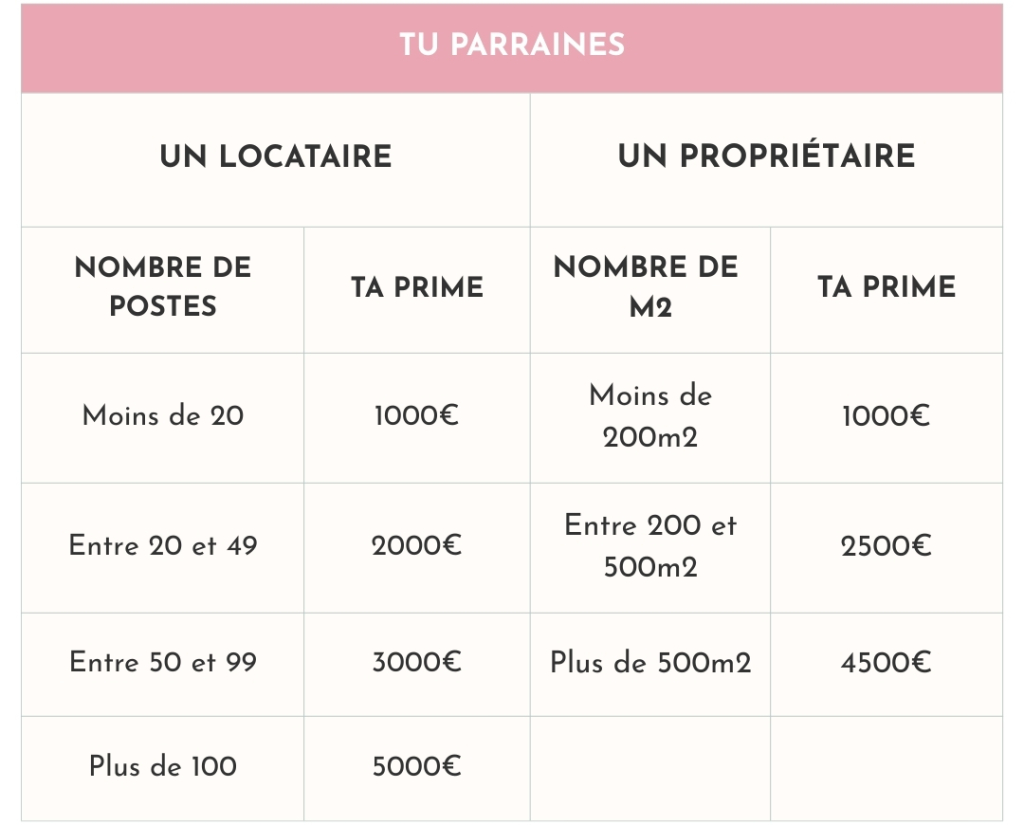 Le programme de parrainage est ouvert à toute personne majeure. Particulier ou professionnel, si tu connais quelqu’un qui recherche des bureaux, tu peux le parrainer !
